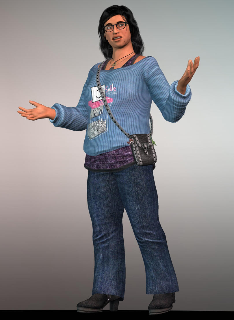 Rebecca's palette is light blue, dark blue, and purple. Though she only has one outfit so far, her style is distinctively casual. She loves small cute accessories, like her cat and dinosaur keychains, and her necklaces with a moon design and the Blender 3D software logo. She likes bootcut/flared jeans, future outfits would probably also include those.CREDITS